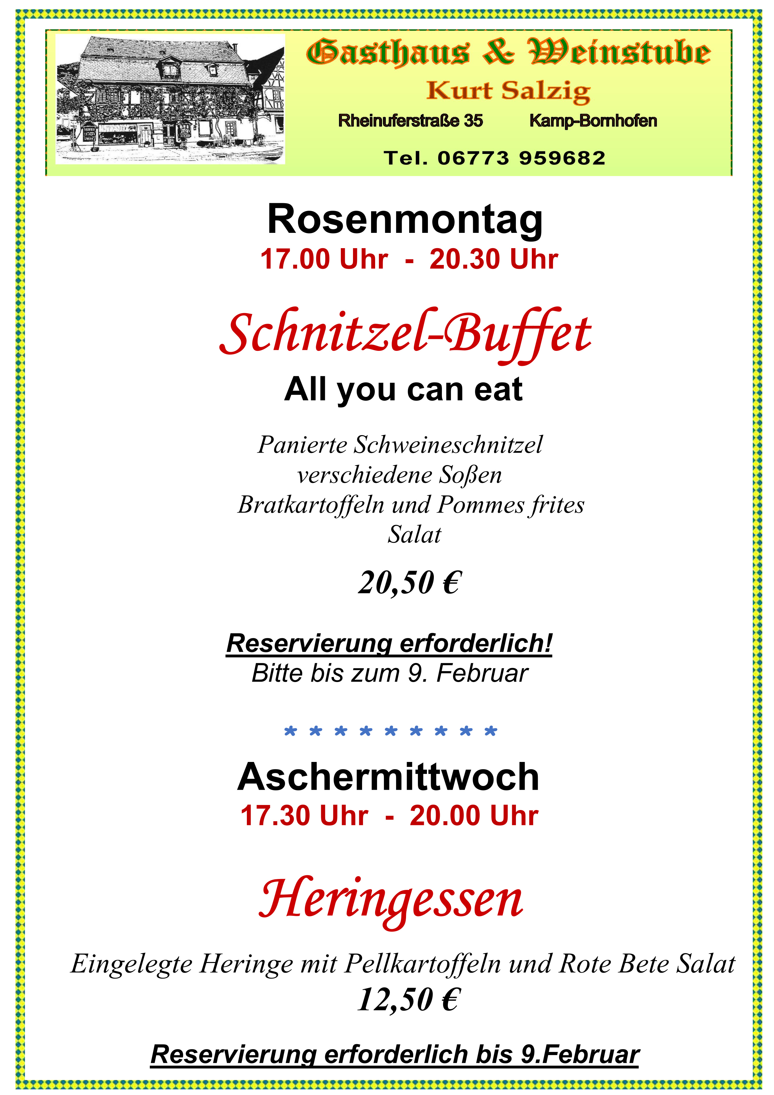 Fastnachtdienstag, 17.2.26, ab 13.00 Uhr (keine Reservierungen möglich) Aschermittwoch, 18.2.26, 17.30 bis 20.00 Uhr (nur mit vorheriger Anmeldung für’s Heringsessen, s. Plakat)